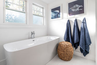 The attached full bathroom is navy and white with spa-inspired amenities such as a soaking tub, double shower heads, double vanities, and a heated towel bar with subway and penny tile accents.